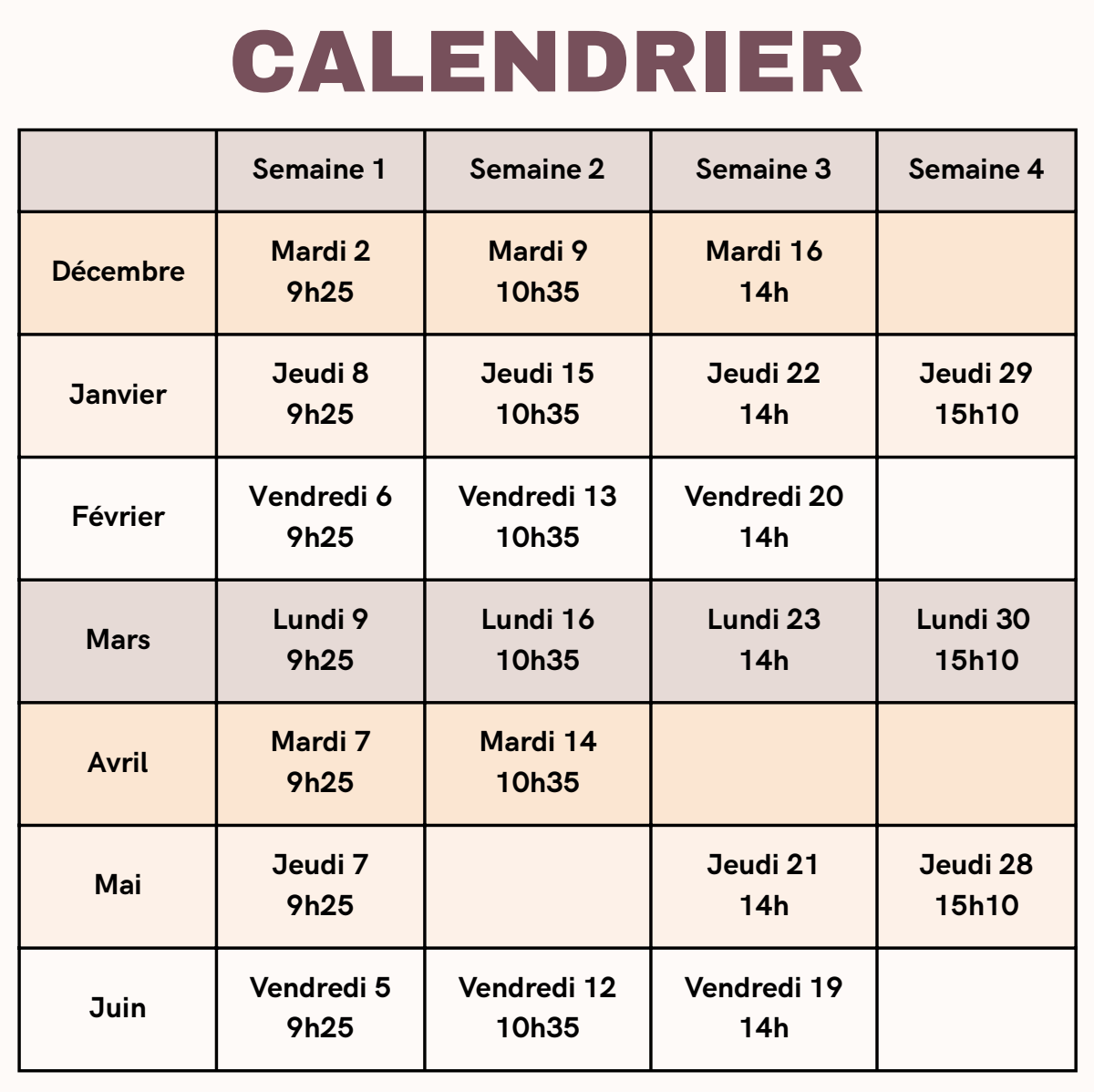 Vous trouverez ci-dessous le calendrier du quart d'heure de lecture. Il aura lieu chaque semaine à des jours et des horaires différents.